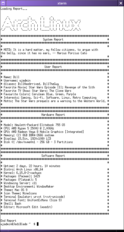 It's called sysreport, and features ASCII art text of the distro name with FIGlet, a MOTD with fortune/fortune-mod, support for the number of packages (compatible with most major linux package managers), and Hardware and User report sections, for all your vanity needs, and it's permissively licensed under the Apache License version 2.0.